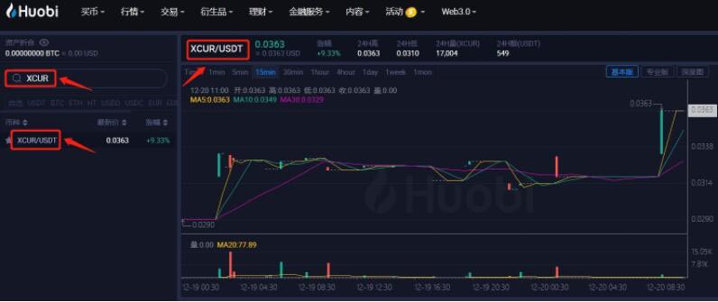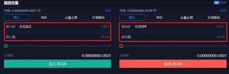 3.在交易对搜索框输入XCUR,选择XCUR/USDT交易对进行交易