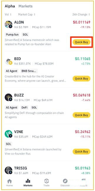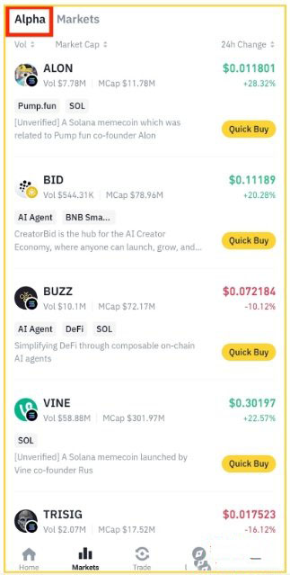 1. 访问路径:通过币安APP【更多服务】进入钱袋功能,在【市场】选项卡找到Alpha专区