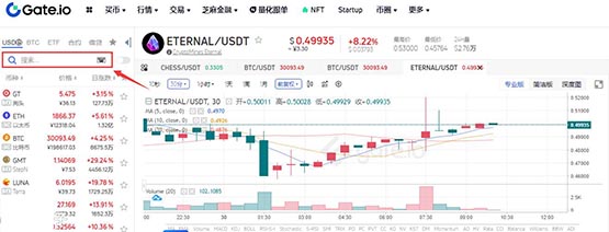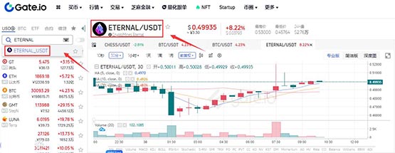 2. 在搜索栏输入项目英文简称"ETERNAL"定位交易对。