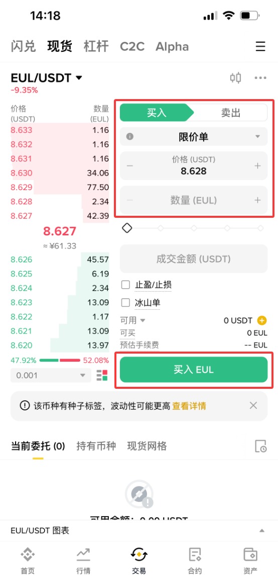 以下为币安平台购买EUL的详细图文教程: