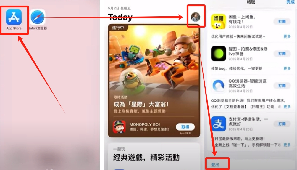 购买完成之后,我们打开我们的apple store,点击右上角的小人头像,往下捯,点击【登出】。这样就把我们原来所登录的apple ID退掉了。