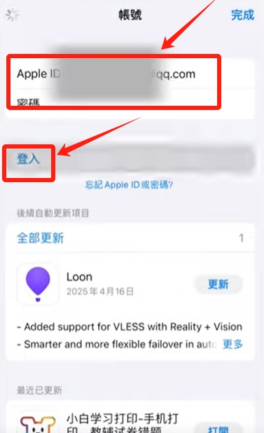 退掉之后我们在输入进我们购买好的海外的apple ID的账号。注意千万不能是美国区的,因为美国区的Apple ID它只能下载到一个币安的阉割版,里面有很多功能是用不了的,所以我们最好去使用购买的apple ID。输入完成后点击【登入】。