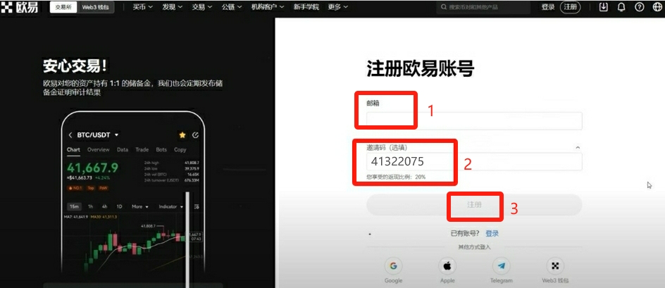 在这里输入一下你的邮箱,大家注意邀请码一定要填写41322075,可以看到“您享受的返现比例是20%”。使用我的邀请码可以永久给您返现20%的手续费优惠。然后点击【注册】。
