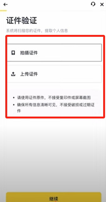 在币安官网注册之后,他会直接给我们跳转到了身份认证的页面。我们先选择一下我们的居住国家和地区,以及证件签发国家和地区。然后选择一下我们想要用来认证的证件类型,我这里就选择“身份件”,点击【继续】。