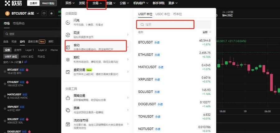 1、打开欧易(官方注册 官方下载),选择交易,点击合约,并选择要进行币种,例如BTC。