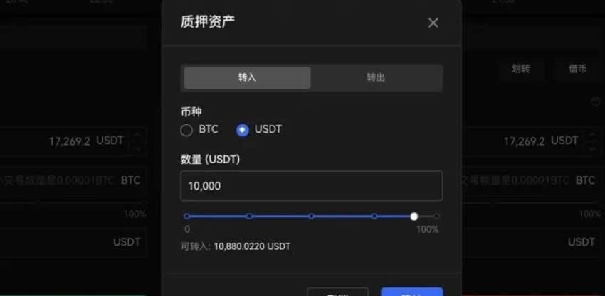 4、可在“划转”中输入要从资金账户转入到一键借币账户的金额。这是你要为这笔交易提供的质押。在本例中,将划转10,000 USDT并选择“确认”。
