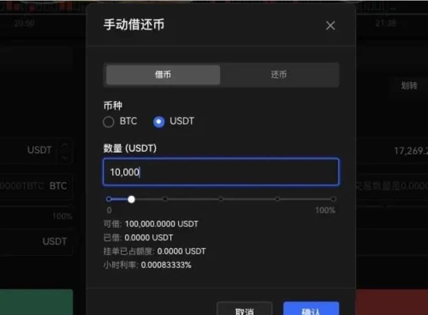 5、在手动模式下,接下来需要确定借币数量。假设需要20,000 USDT来完成交易,并且已从资金账户划转10,000 USDT。在这种情况下,您将借用10,000 USDT并选择“确认”。