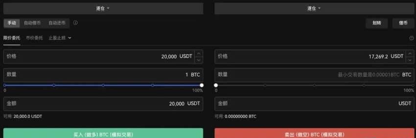 6、现在您有 20,000 USDT 可用于交易。假设BTC价格是 20,000 USDT。输入 USDT 价格和您想要买入的数量,并选择“买入(做多)BTC”。