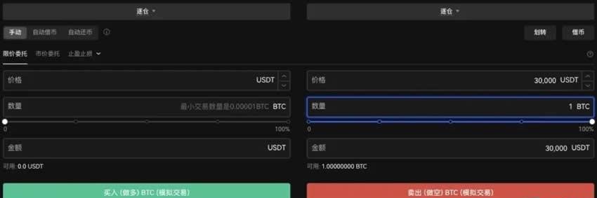 7、假设 BTC 价格已涨到 30,000 USDT。为了清除做多仓位,可输入价格 (USDT) 和数量 (BTC) ,并选择“卖出(做空)BTC”,即可卖出BTC。