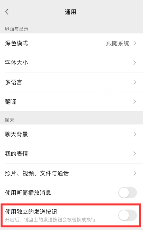 微信默认的键盘中右下角只有发送按键,想要在输入文字内容时并进行换行,可以在设置中选择通用设置,然后将下方的使用独立的发送按钮勾选上,勾选开启后键盘上的发送按钮就会被替换成互换行。