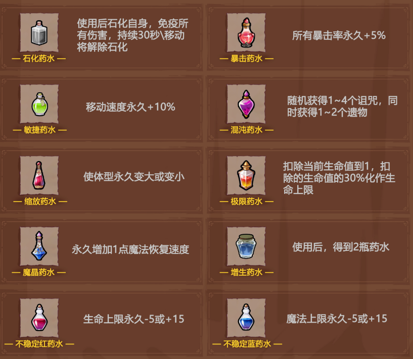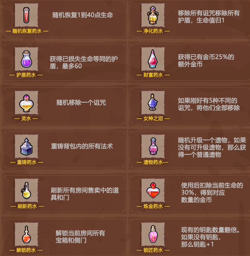 2、净化药水:移除所有诅咒移除所有护盾,生命值归1