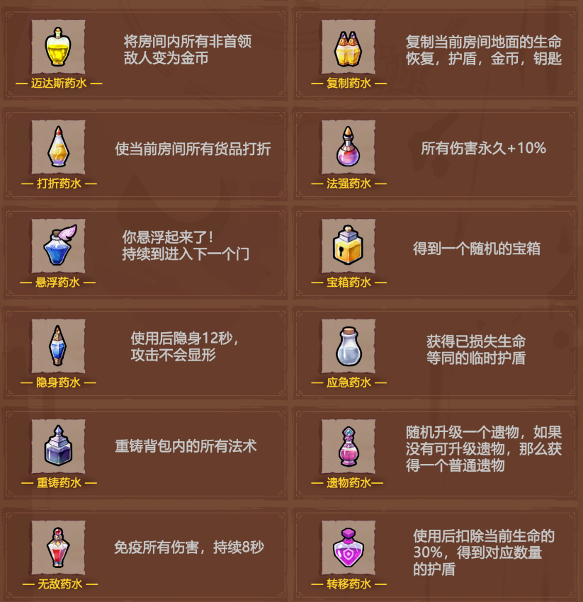 12、复制药水:复制当前房间地面的生命恢复,护盾,金币,钥匙