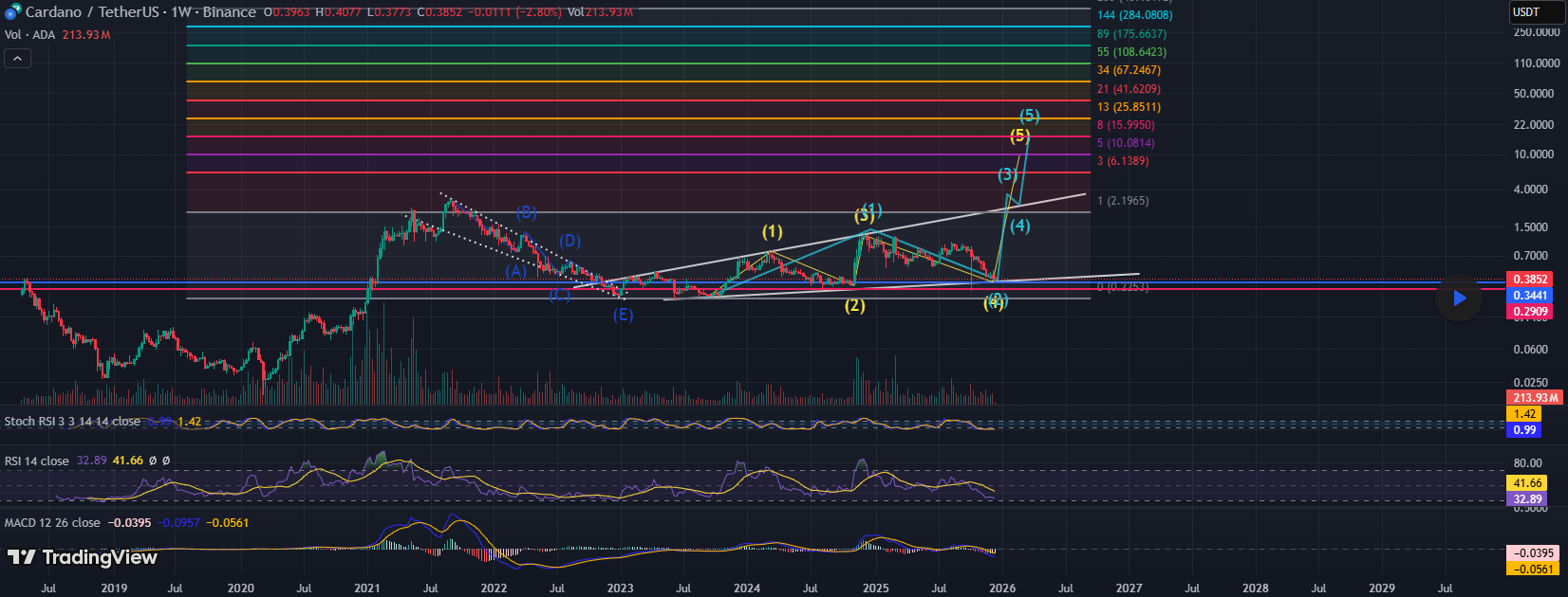 2023年9月支撑区域开始形成完整的艾略特波浪结构,第一驱动浪在2024年12月将ADA推至1.32美元高点。随后展开的第二调整浪持续至今,形成当前0.37美元的价格低点。