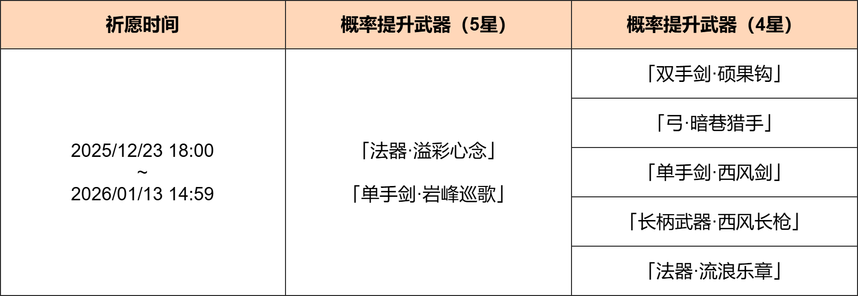 活动期间,限定4星武器「双手剑·硕果钩」「弓·暗巷猎手」、4星武器「单手剑·西风剑」「长柄武器·西风长枪」「法器·流浪乐章」的祈愿获取概率将大幅提升!