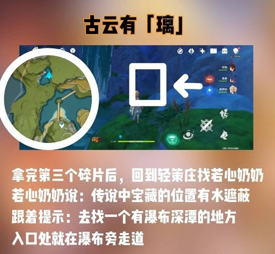 传送回去轻策庄找若心奶奶,他会告诉你宝藏位置。传送到锚点往下走,入口处就在瀑布旁边