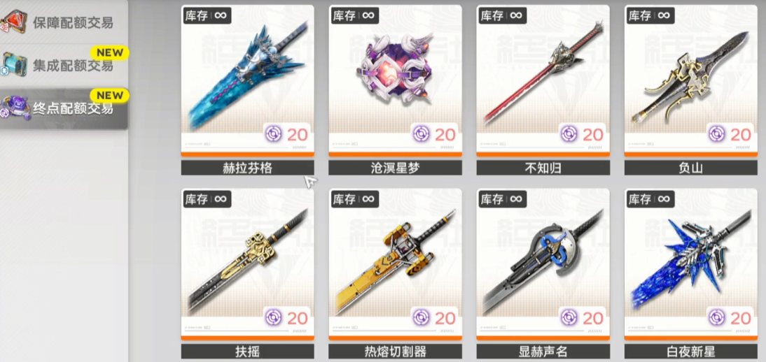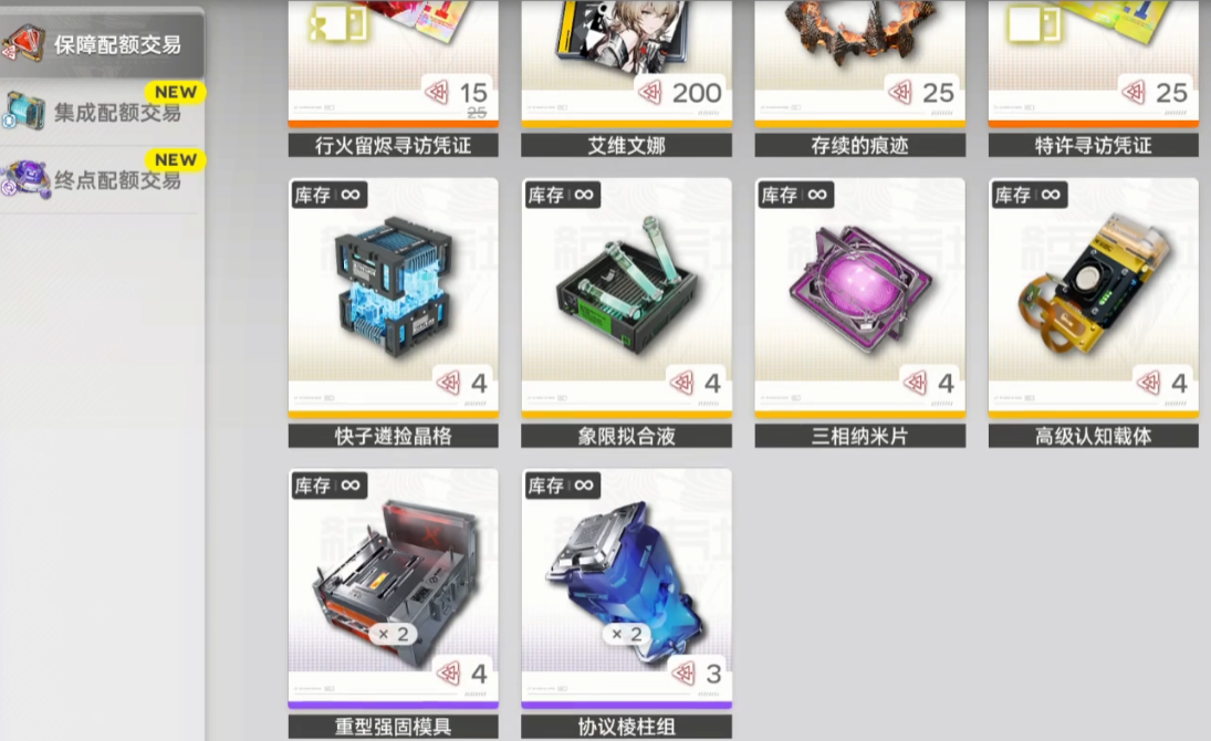 终点配额交易专司武器兑换,其货币由六星干员信物转化而来。需注意:每1个未使用的六星信物仅可兑换10点终点配额货币,折算效率较低。例如,获取1把六星干员专属武器需消耗2个闲置信物。因此,仅推荐为主力输出干员(主C)兑换其专属武器,确保资源投入产生明确战力回报。