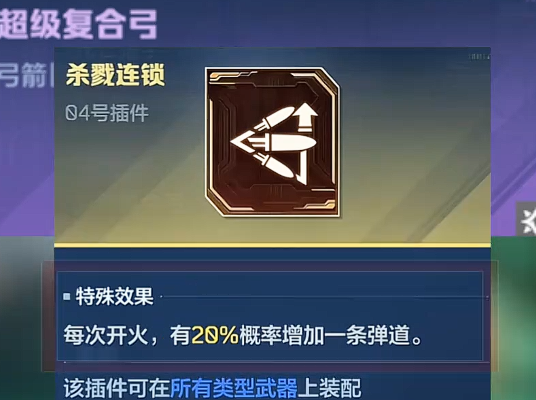 第四枚芯片选用【杀戮连锁】。该芯片提供概率性额外弹道发射,虽触发率非100%,但在超级复合弓的蓄力射击模式下,配合高命中率与稳定站位,可稳定产出二次攻击机会。该效果不仅直接提升DPS,还能与【多重伤害】【协频共振】形成联动:额外箭矢同样计入伤害段数与命中次数,进一步加速技能充能与增伤叠加,构建高效循环体系。