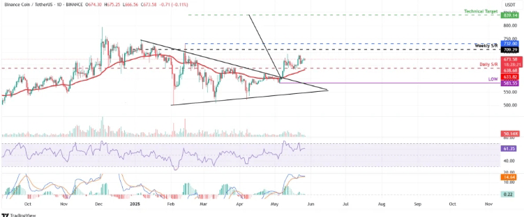 对称三角形突破形态显示,BNB短期目标价位于839.14美元。RSI指标维持61的看涨区间,MACD呈现温和收敛。关键支撑位分别位于638.68美元和583.55美元。