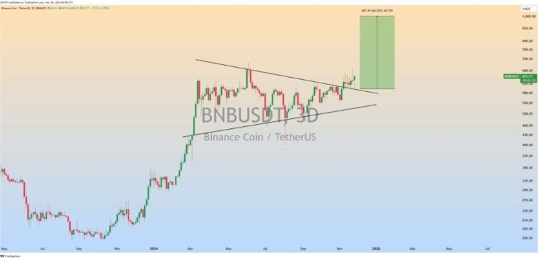 分析师ZAYK Charts指出,BNB三日图完成看涨三角旗形态,量度目标位直指1000美元上方。需重点关注686美元阻力位的有效突破。