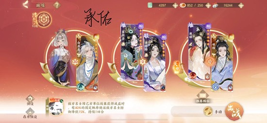 文曲:这关最好先打李师师,要不然后期李师师一个特性奶一万还净化建议特别容易伤害不够!如果生存压力很大的话建议第一第二回合邓绥特性分别给韩非于谦,第三回合再开大生存压力能小很多