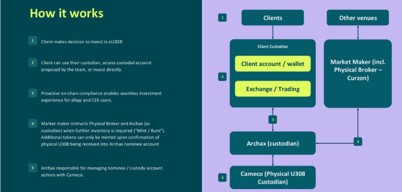 XU3O8代币是全球首个铀资产数字化解决方案,每个代币对应实物铀的所有权。该资产由全球三大铀供应商之一Cameco负责存储验证,并通过英国FCA监管的Archax机构进行托管,确保资产透明度与安全性。
