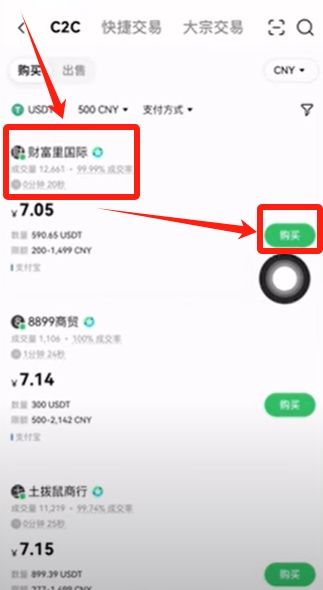 进入C2C交易区后输入购买金额,系统自动换算对应USDT数量。建议选择成交量超万单、好评率99%以上的优质商家进行交易。