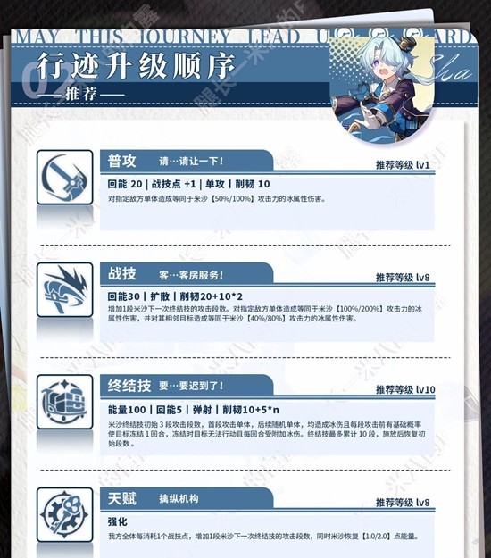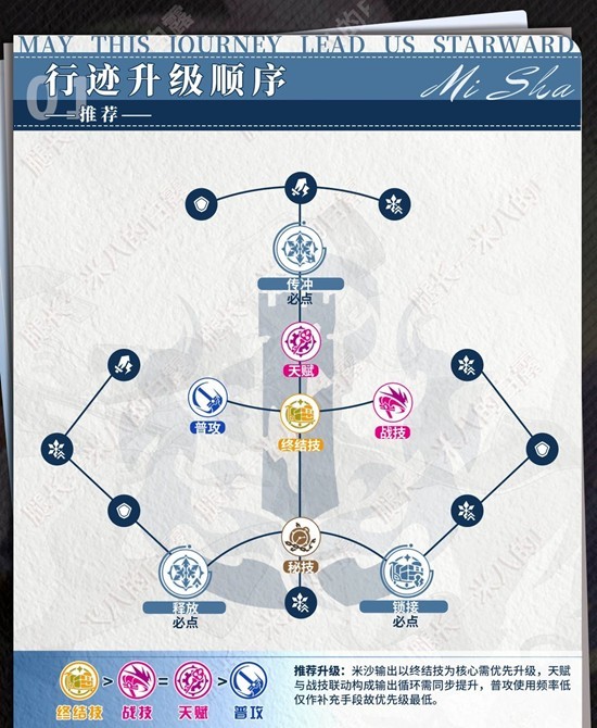 推荐升级:米沙输出以终结技为核心需优先升级,天赋与战技联动构成输出循环需同步提升,普攻使用频率低仅作补充手段故优先级最低。