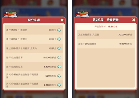 活动分为7个阶段:实力冲刺、狩猎野兽、英雄成长、训练士兵、英雄装备、采集资源和领主装备,每个阶段持续1天。