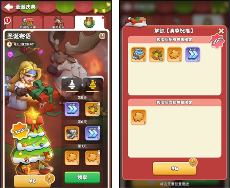 每上交1份“圣诞装饰”可以获得1-3积分,达到指定分数可以提升圣诞树等级,并领取该等级的奖励,等级分为2、7、12、16、20、22、24级。