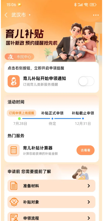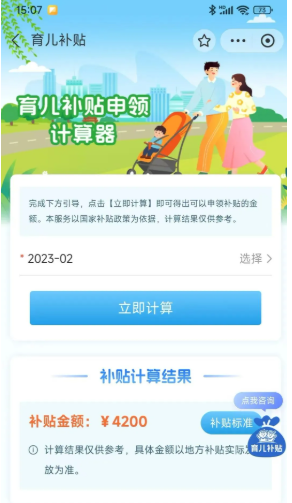 第三步:使用内置计算器功能,选择幼儿出生日期进行补贴金额测算