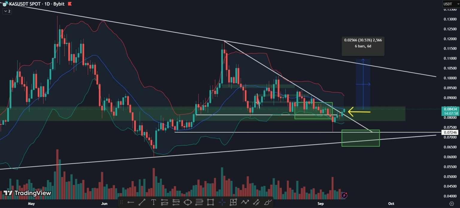 截至2025年9月,KAS价格0.0980美元,市值26亿美元排名43位。近一月涨幅达31.49%,200日均线0.086美元形成强支撑。技术指标显示: