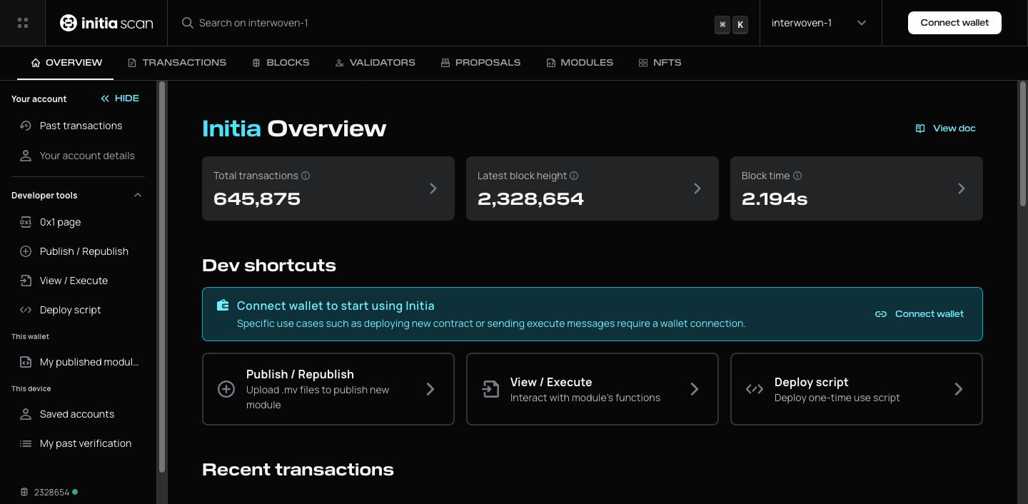 Initia Scan是一款专为追踪并可视化Initia Layer 1及其Minitias数据而开发的区块链浏览器。该平台提供区块、交易、账户和治理活动的实时索引服务。用户可通过交易哈希值、区块高度或钱袋地址进行精准搜索。此外,该浏览器还能展示与特定账户相关联的质押余额、交易历史记录以及NFT所有权等详细信息。