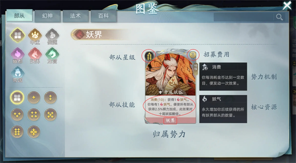 在备战阶段,玩家可以在天书中看到可以招募的部从信息,在这里不仅能看到对应的势力,还能看到部从的技能以及可利用的势力机制。
