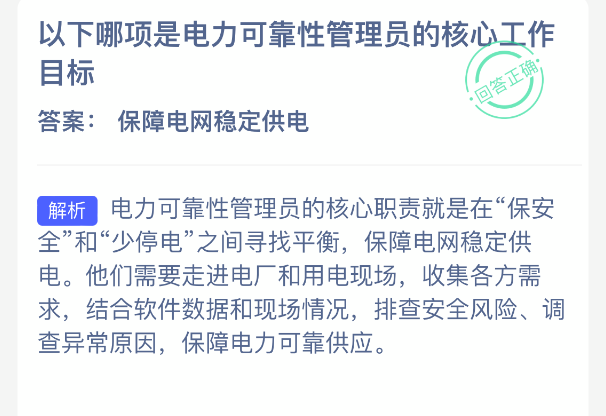 以上就是以下哪项是电力可靠性管理员的核心工作目标?支付宝蚂蚁新村最新答案2025年12月16日,更多精彩内容,请点击关注本站手游网更新!