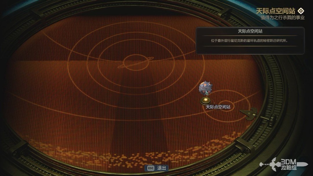 对话结束后我们跟着目标点回到游戏刚开始的地方,和面前的机器互动,选择“天际点空间站”传送过去。这是我们去的第一个星球。