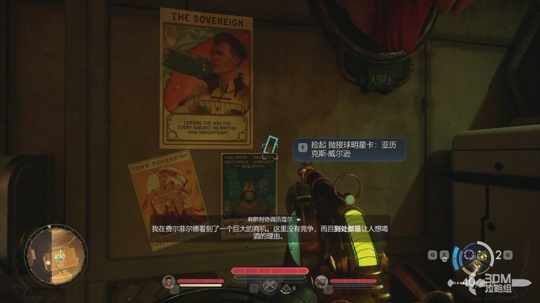跟着目标点来到小镇,可以先进酒吧和酒吧里的人聊聊。吧台后面的海报上还能获得一个收集品“抛接球明星卡:亚历克斯·威尔逊”。