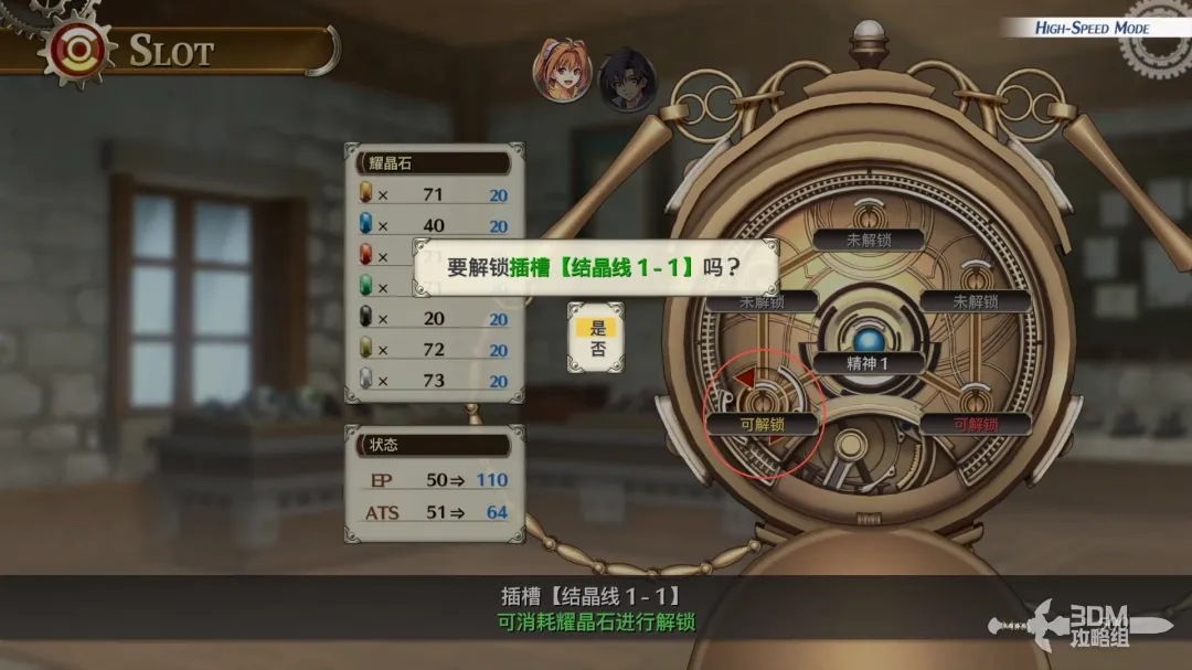 在商人处,打开Slot标签,然后选择艾丝蒂尔或者约书亚其中一人的战术导力器,解锁结晶线1-1。