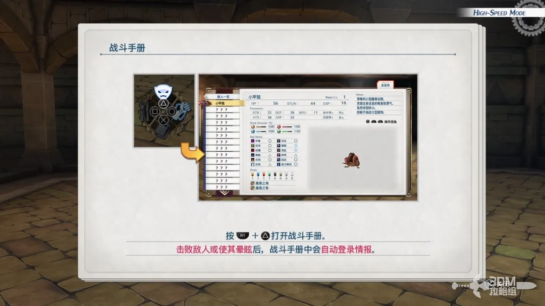 按圆圈键普通攻击,每次击败魔兽或者击晕魔兽会自动记录在刚刚雪拉小姐给的战斗手册上,按R1+△打开战斗手册可以更进一步了解魔兽的弱点!