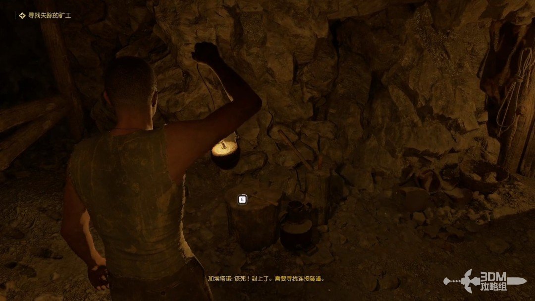 接着画面来到深矿,我们跟着同伴走,走到这个位置拿一下挂在旁边的灯,矿洞里好像有瓦斯。