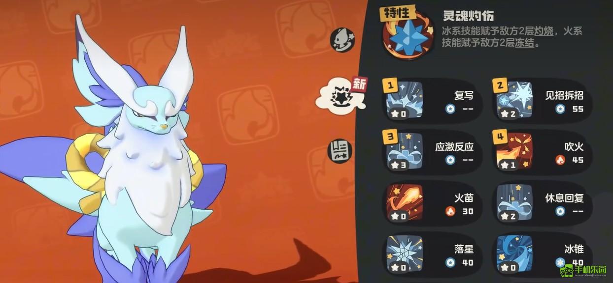 再来看看它的特性,灵魂灼烧这个特性真的挺有意思。用冰系技能打人的时候会给对面叠灼烧效果,用火系技能的时候又能叠冰冻效果,这种交叉叠加的机制让尖嘴狐仙的持续输出能力变得很强。敌人身上的负面状态越多,受到的伤害自然也就越高,打起来会越来越轻松。
