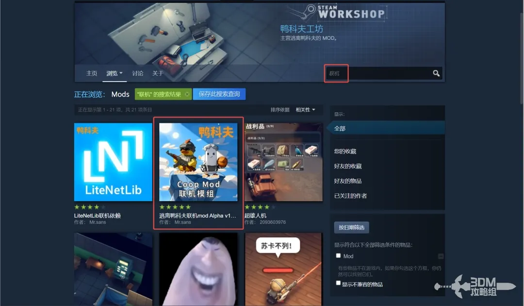 在创意工坊中搜索并找到所需的联机mod(注意作者名字)