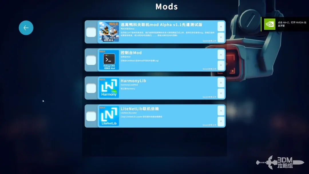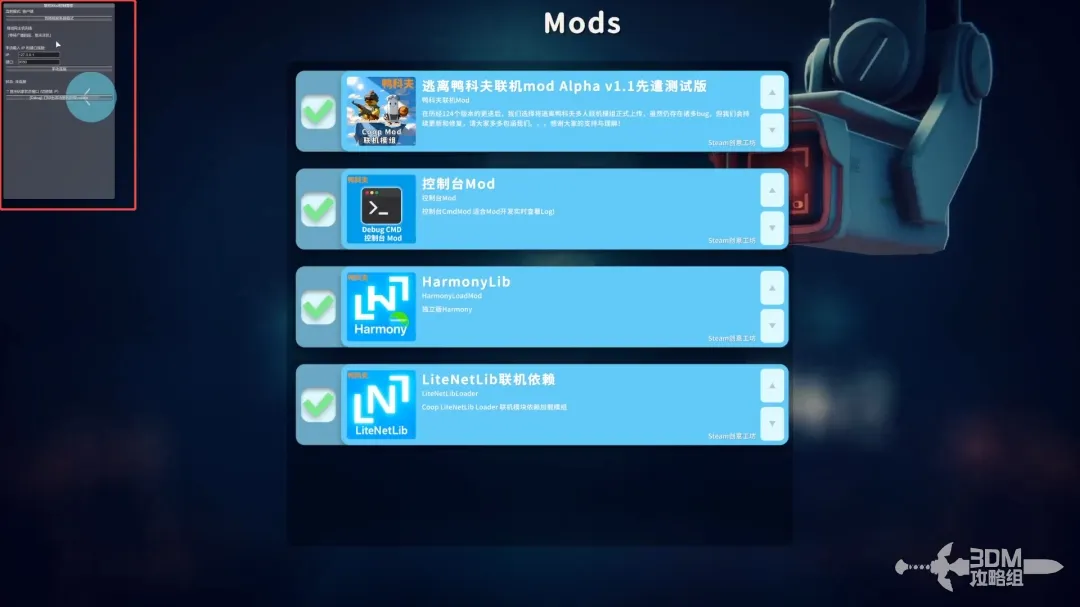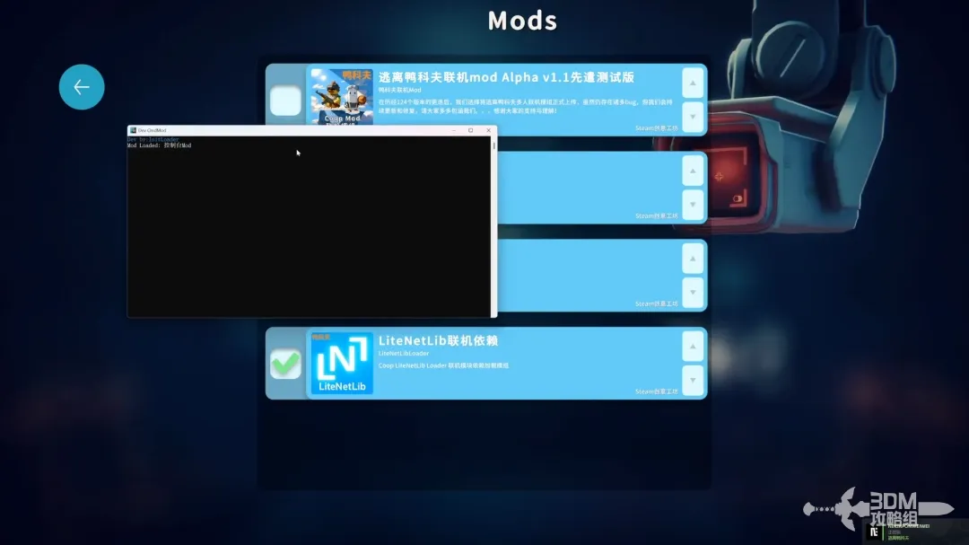 从下往上依次激活mods,两个前置mods,一个控制台mod,和联机mod。