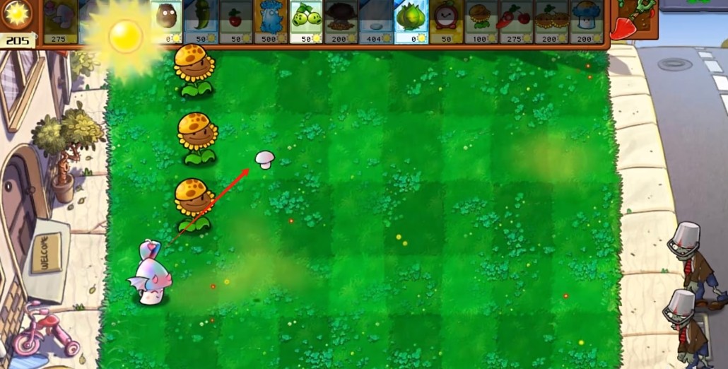 ①普通子弹(白色圆顶蘑菇,60%概率):对目标所在格全部僵尸造成50点伤害(单格无衰减溅射),无其他特殊效果