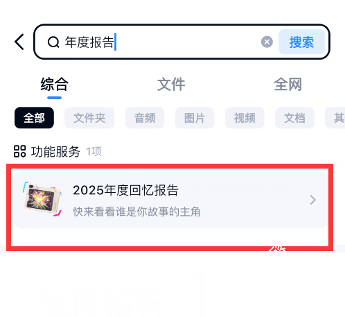 百度网盘今年2025年底也可以查看年度报告啦,在首页中可以看到顶部的弹窗,也可直接搜索年度报告来查找,点击后即可进入查看,能够选择模板并添加照片来生成,还可以看到最终生成的年度称号内容!