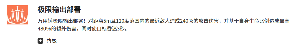 其终极技能“极限输出部署”虽具备240%基础倍率与最高480%血量加成伤害,但设计定位仍以功能性为主:对5米内120度扇形区域造成范围伤害并附加3秒眩晕,为队友创造安全输出环境。辅助技能“支援技能补充精力”则可在释放主技能后,为全体友方提供10秒30%最终伤害减免,与遗物减伤形成多层防护叠加,显著提升整支队伍的容错率与续航能力。