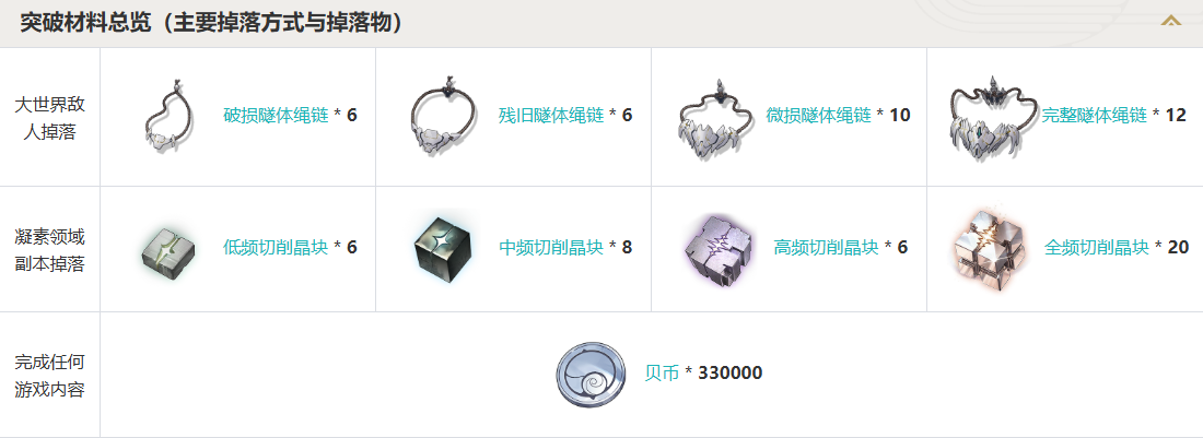 贝币×330000、破损隧体绳链×6、残旧隧体绳链×6、微损隧体绳链×10、完整隧体绳链×12、低频切削晶块×6、中频切削晶块×8、高频切削晶块×6、全频切削晶块×20