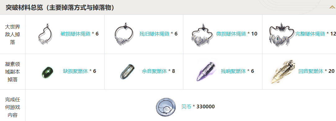 贝币×330000、破损隧体绳链×6、残旧隧体绳链×6、微损隧体绳链×10、完整隧体绳链×12、缺损聚燃体×6、余音聚燃体×8、残响聚燃体×6、回音聚燃体×20