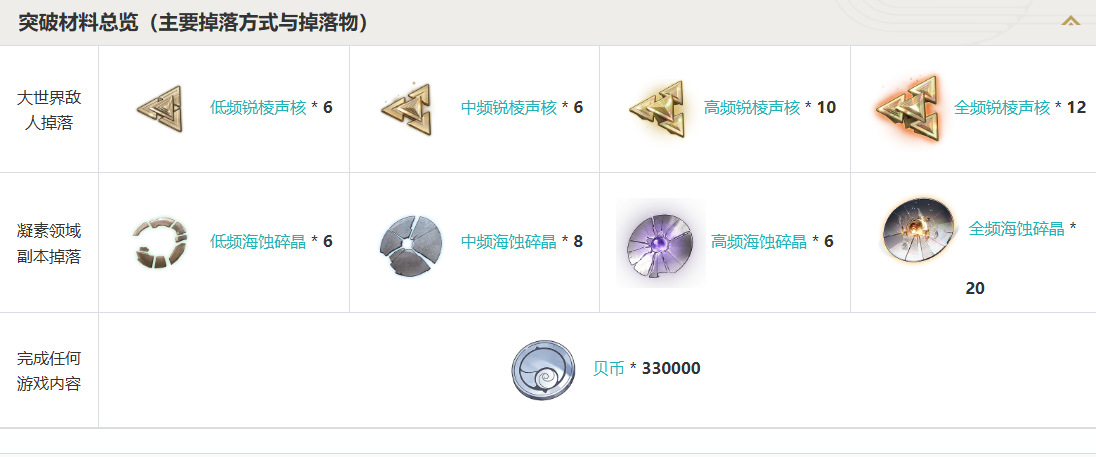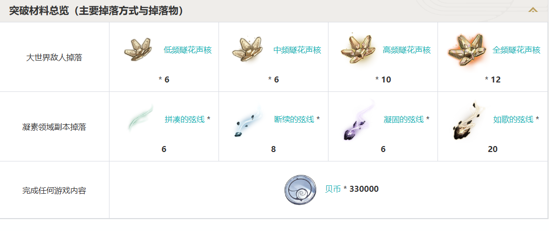 贝币×330000、低频隧花声核×6、中频隧花声核×6、高频隧花声核×10、全频隧花声核×12、拼凑的弦线×6、断续的弦线×8、凝固的弦线×6、如歌的弦线×20