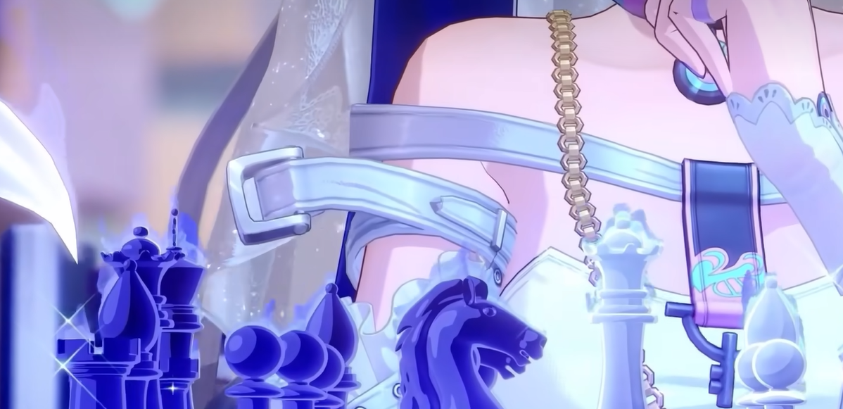 服饰风格上,妮夏采用典型欧式古典剪裁,立领、束腰与层叠裙摆构成视觉主干,辅以暗纹刺绣与金属扣饰等细节。此类设计与其国际象棋符号形成文化语义闭环,暗示背景设定或关联欧洲民间幽灵传说或贵族秘仪体系。整体造型在庄重感中注入不可测的疏离气质,尤其发光长发在动态战斗中将强化光影层次与动作辨识度,提升实战视觉反馈质量。