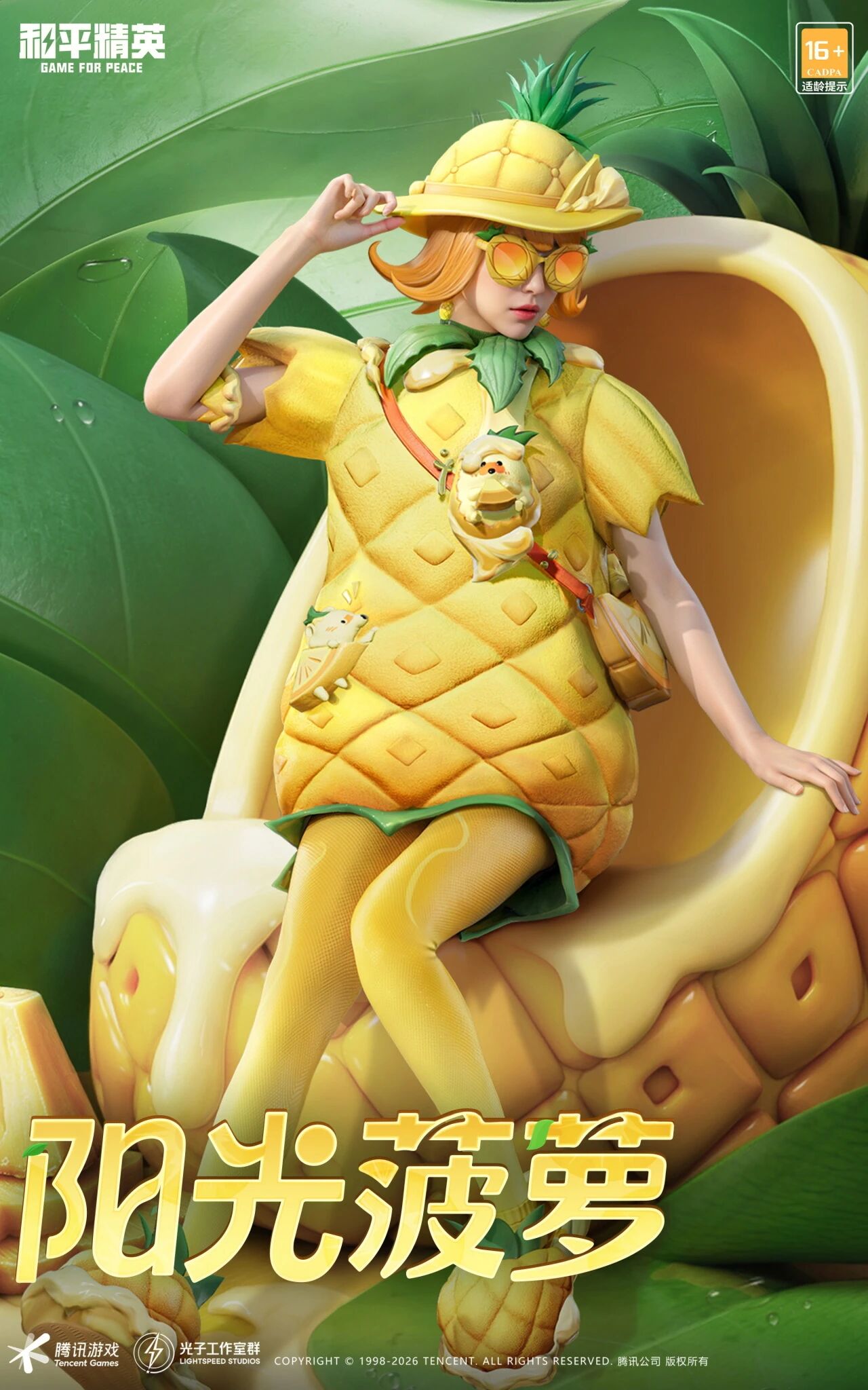 1.3折限时购买新年礼包啦!活动期间,花24元即可购买全新套装-【阳光菠萝】,枪皮-【Mk14-阳光菠萝】仅需6元。